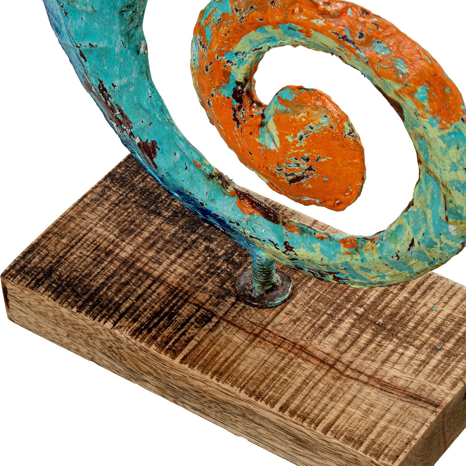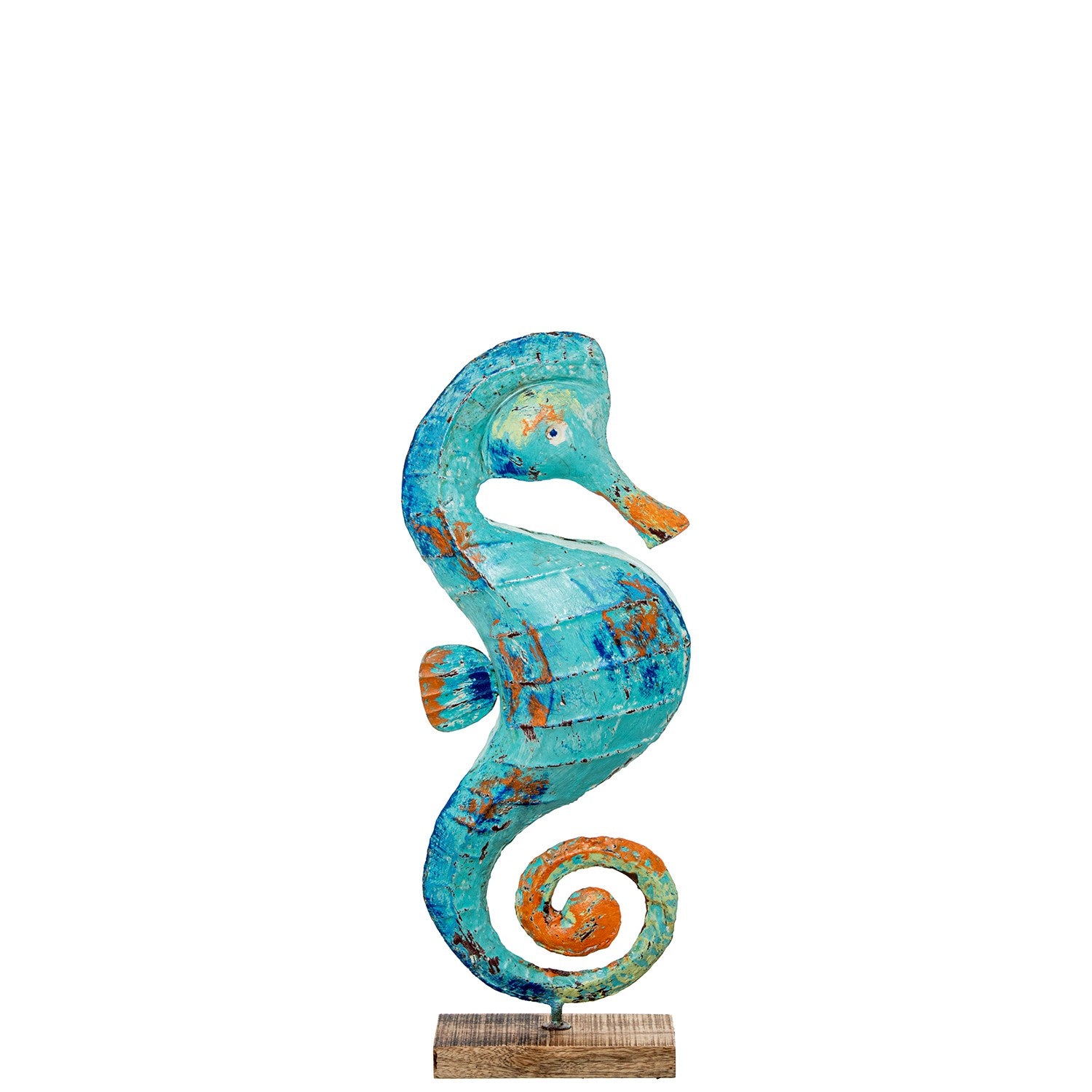 Esta figura decorativa con forma de caballito de mar combina la resistencia del hierro con la calidez de una base de madera natural, dando vida a una pieza delicada, simbólica y con mucha personalidad. Su diseño estilizado y textura artesanal la convierten en un acento decorativo ideal para cualquier espacio que busque un toque marino y natural.
