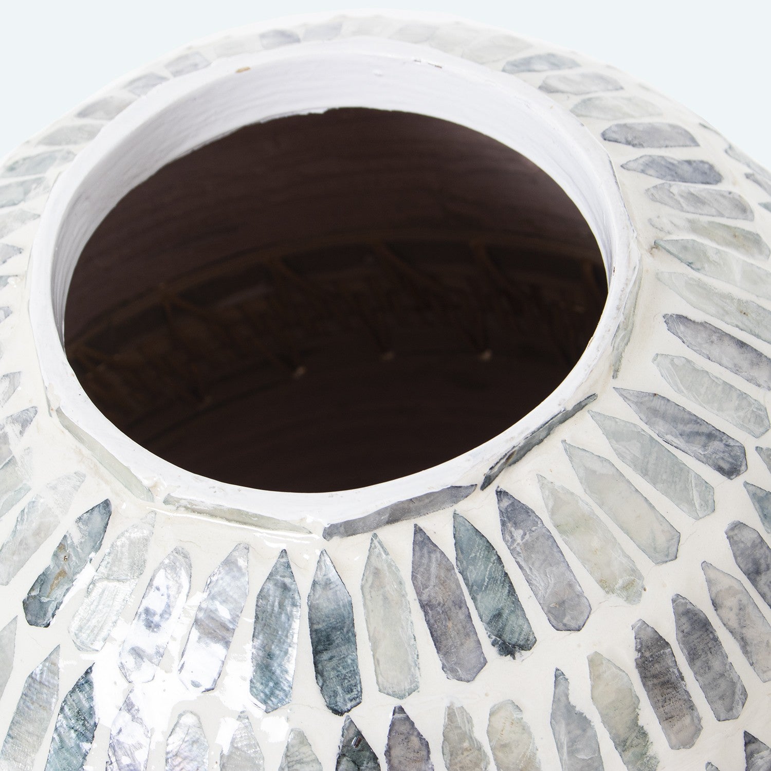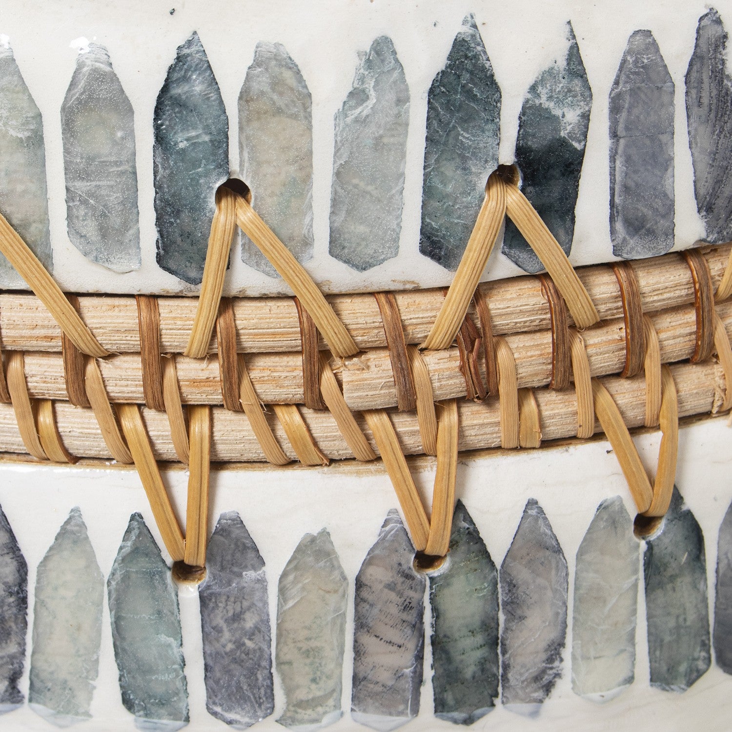 Materiales de Alta Calidad: Fabricado con auténtico nácar y ratán natural, nuestro jarrón está diseñado para durar y mantener su belleza a lo largo del tiempo.