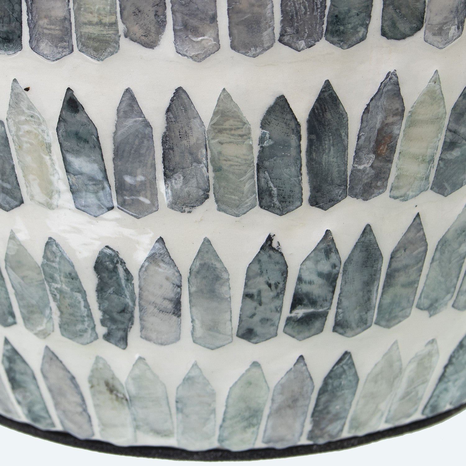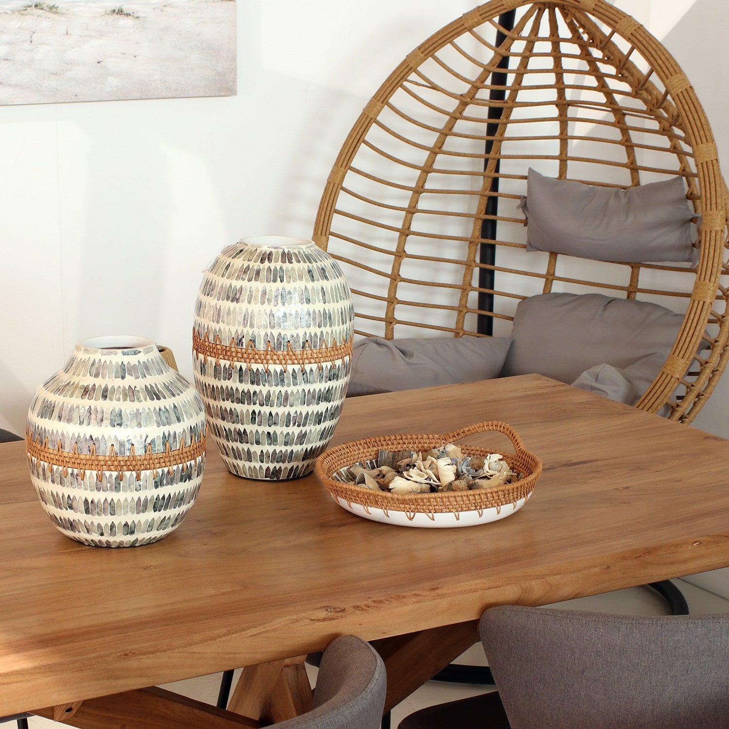 Diseño Único y Elegante: Este jarrón combina la iridiscencia del nácar con la calidez del ratán, creando una pieza decorativa que añade un toque de lujo y sofisticación a cualquier espacio.