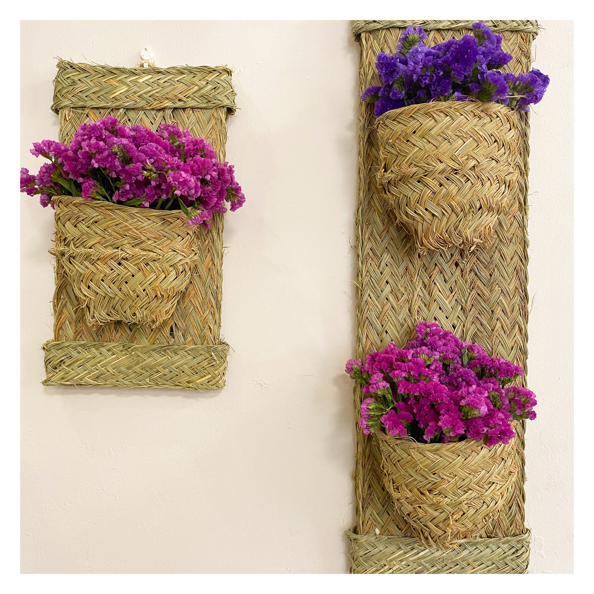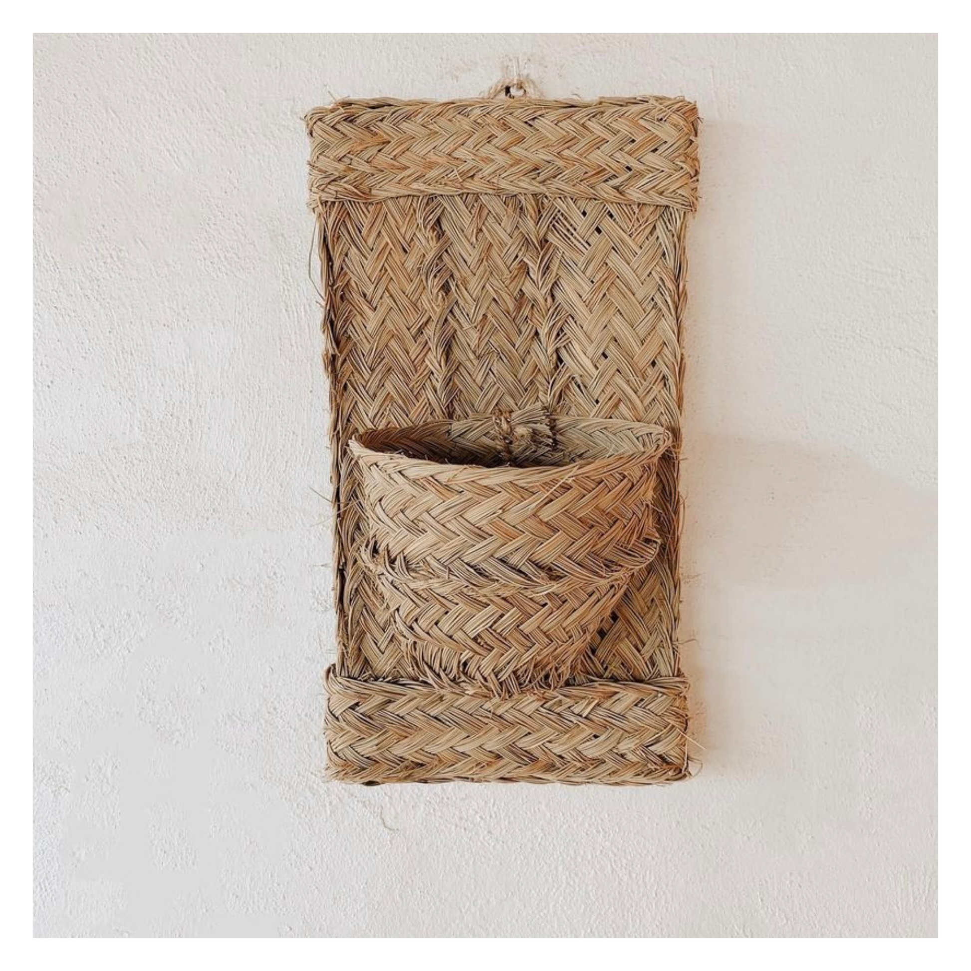 Con un solo bolsillo y un diseño limpio, está pensado para colocar pequeñas plantas, flores secas o ramitas aromáticas, creando rincones frescos, luminosos y llenos de calma. Su fibra natural aporta textura y calidez, integrándose con facilidad en espacios mediterráneos, rústicos o contemporáneos.