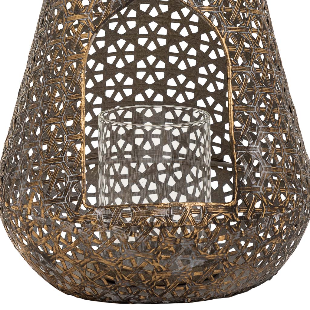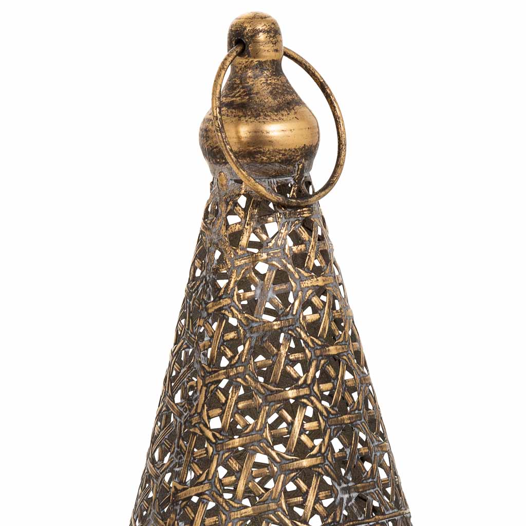 Fabricado con metal con acabado dorado envejecido, su diseño calado deja pasar la luz de forma delicada, creando un ambiente envolvente tanto de día como de noche.
