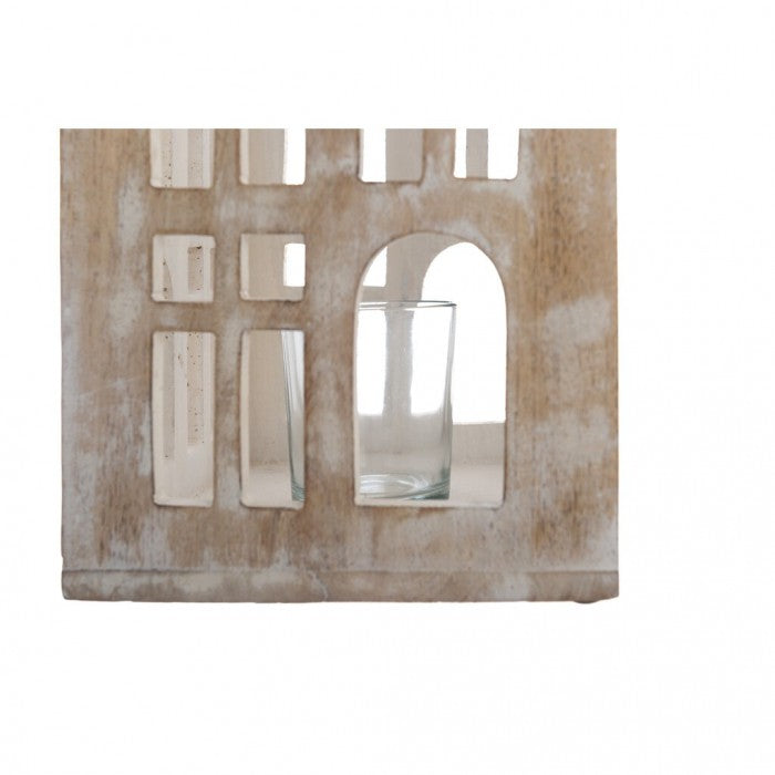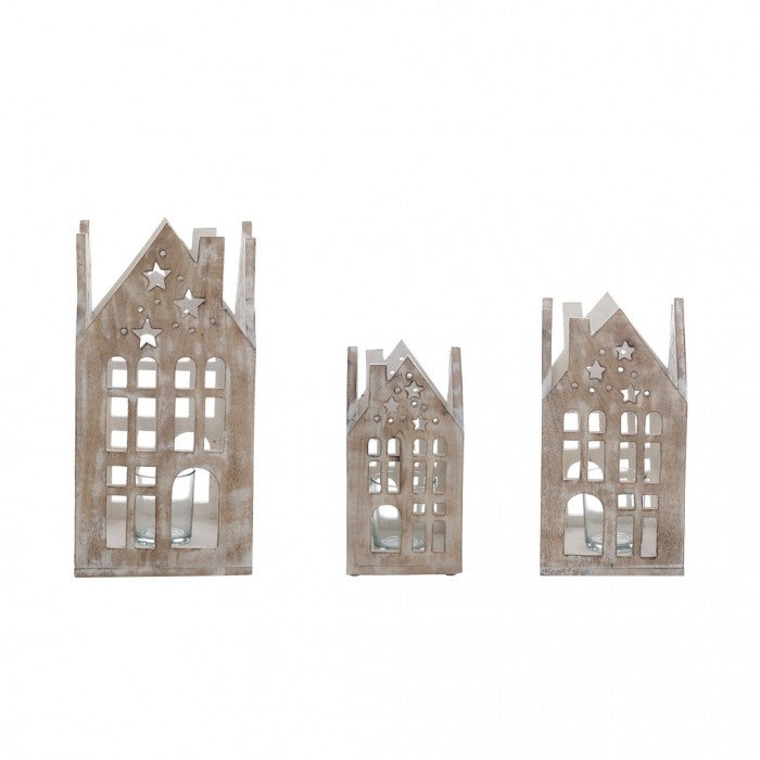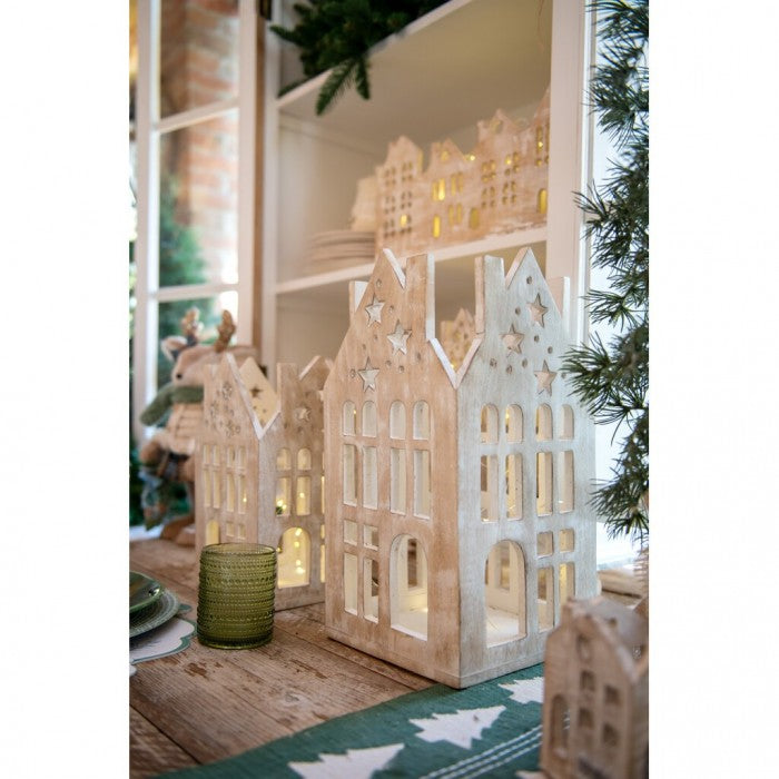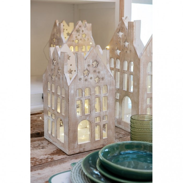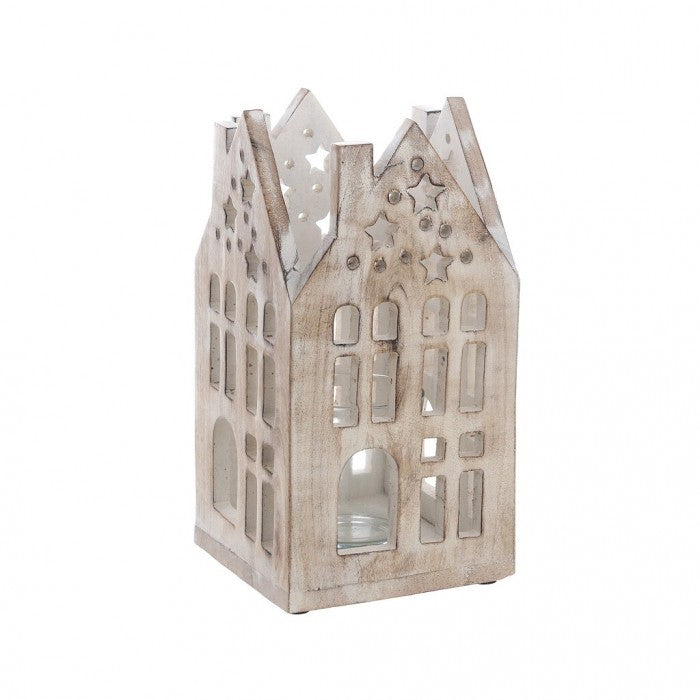Farol con forma de casita, con aberturas en forma de estrella y ventanas que dejan pasar la luz. Un conjunto que evoca ambientes nórdicos y noches de invierno iluminadas por mil reflejos.
