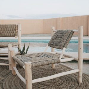 Sillón de madera natural y cuerdas de sisal hecho completamente a mano por artesanos marroquíes.